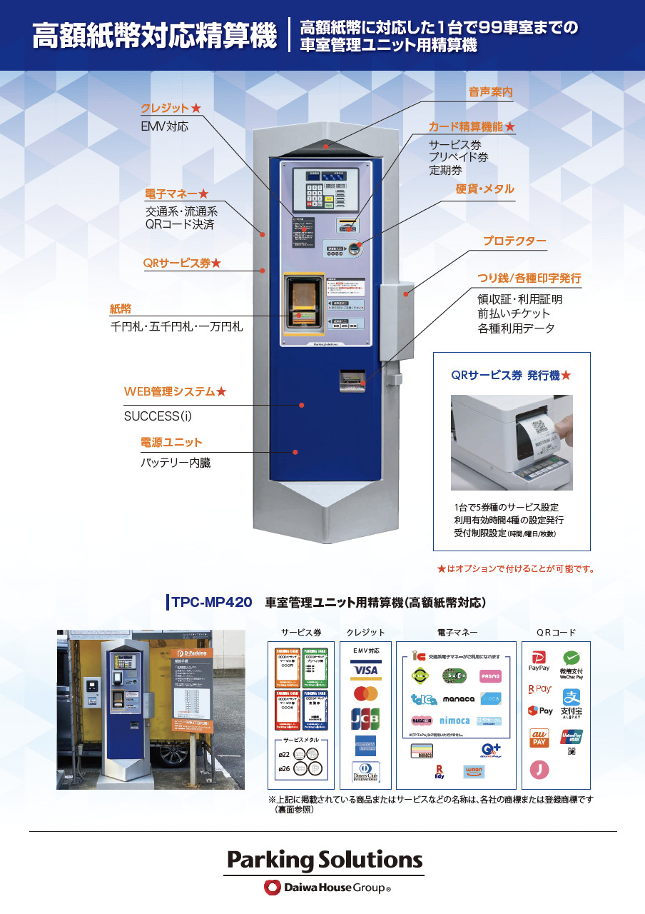 高額紙幣に対応した1台で99車室までの車室管理ユニット用精算機 |